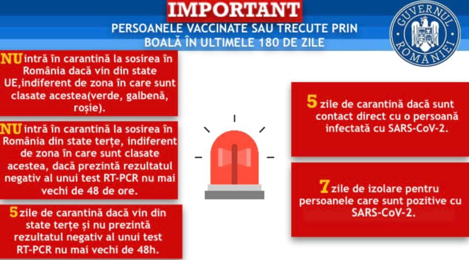 • persoanele nevaccinate ori persoanele care nu au fost confirmate pentru infecศ›ia cu virusul SARS-CoV-2 รฎn ultimele 180 de zile anterioare intrฤƒrii รฎn ศ›arฤƒ, care sosesc din zona roศ™ie ศ™i rฤƒmรขn pe teritoriul naศ›ional pentru o perioadฤƒ mai micฤƒ de 3 zile (72 de ore) dacฤƒ prezintฤƒ rezultatul negativ al unui test RT-PCR pentru infecศ›ia cu virusul SARSCoV-2, efectuat cu cel mult 72 de ore รฎnaintea รฎmbarcฤƒrii (pentru cei care cฤƒlฤƒtoresc cu mijloace de transport รฎn comun) sau intrฤƒrii pe teritoriul naศ›ional (pentru cei care cฤƒlฤƒtoresc cu mijloace proprii).ย ATENศšIE!!!ย รŽn situaศ›ia รฎn care aceste persoane nu pฤƒrฤƒsesc teritoriul naศ›ional รฎn cele 3 zile (72 de ore), cu informarea direcศ›iei de sฤƒnฤƒtate publicฤƒ din judeศ›ul รฎn care locuiesc sau รฎn care au adresa declaratฤƒ la intrarea รฎn ศ›arฤƒ, vor fi carantinate pentru o perioadฤƒ de 14 zile, รฎncepรขnd cu cea de-a patra zi ulterioarฤƒ intrฤƒrii pe teritoriul Romรขniei;