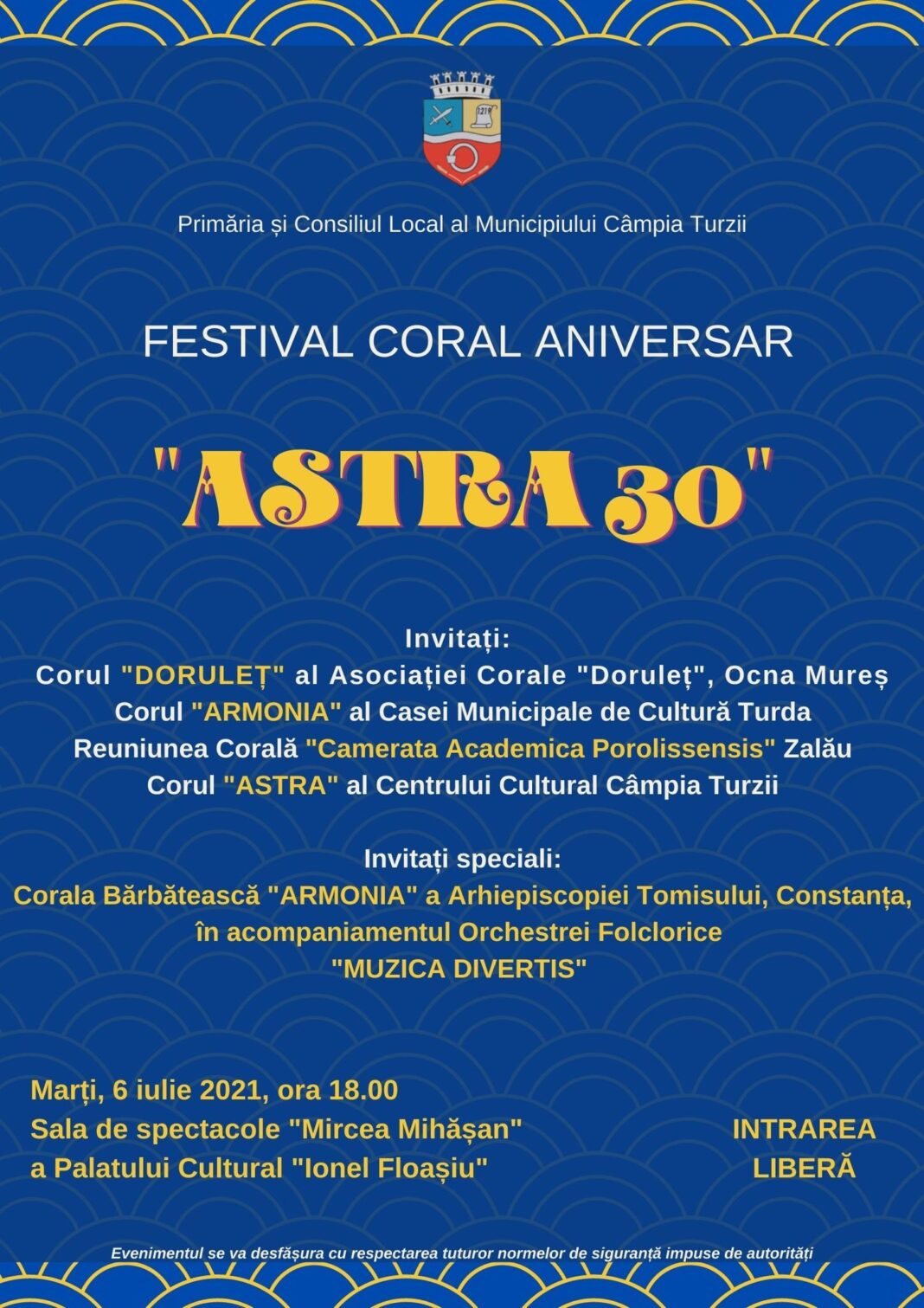 Împlinirea celor 30 de ani de activitate a Corului „Astra” al Centrului Cultural Câmpia Turzii reprezintă un moment artistic, de necontestat în rândurile publicului meloman, iubitor de cultură. Cu un repertoriu de excepție, interpretare artistică de înaltă ținută, acuratețe inconfundabilă – Corul „Astra” scrie de fiecare dată când apare în fața publicului o impresionantă pagină muzical – culturală.