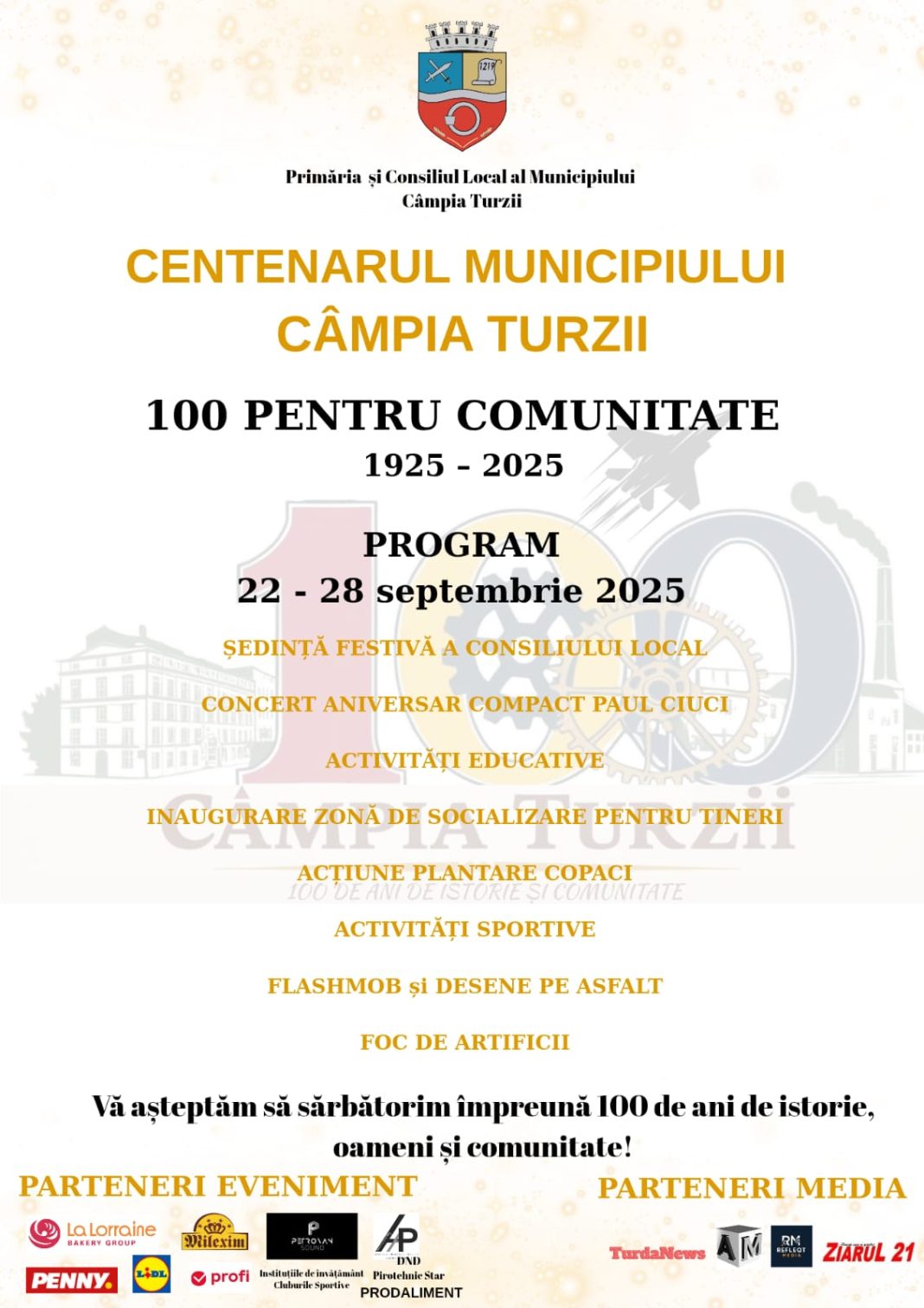 📅 Între 22 și 28 septembrie 2025, sărbătorim împreună Centenarul Câmpiei Turzii. Primăria Municipiului Câmpia Turzii, cu sprijinul partenerilor din unitățile de învățământ, ONG-uri, agenți economici și mass-media a pregătit o săptămână pentru toate generațiile: