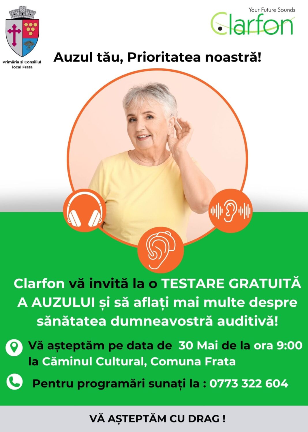 În parteneriat cu Clarfon, Primăria și Consiliul Local Frata organizează o campanie de testare gratuită a auzului, dedicată tuturor celor care doresc să afle mai multe despre sănătatea lor auditivă. Evenimentul va avea loc vineri, 30 mai 2025, începând cu ora 09:00.