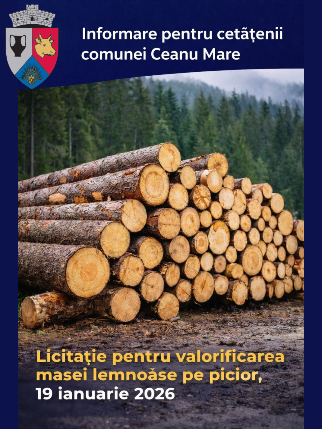 Vă aduc la cunoștință faptul că Ocolul Silvic „Șoimul Arieș” R.A. va organiza, în data de 19 ianuarie 2026, ora 10:00, o licitație publică pentru valorificarea masei lemnoase pe picior, aferentă producției anului 2026. 🌲