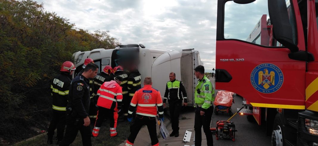 👉 În eveniment au fost implicate două autocamioane, dintre care unul s-a răsturnat pe carosabil. În interiorul acestuia se afla un bărbat de aproximativ 35 de ani, rămas încarcerat între fiarele contorsionate.