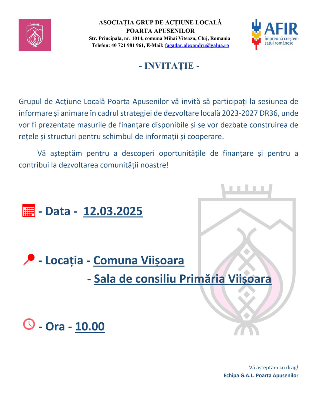 📍 Primăria Comunei Viișoara vă invită să participați la sesiunea de informare și animare organizată de Grupul de Acțiune Locală Poarta Apusenilor! Evenimentul are loc în cadrul Strategiei de Dezvoltare Locală 2023-2027 DR36 și este o ocazie excelentă pentru a descoperi măsuri de finanțare și pentru a dezbate idei de cooperare și dezvoltare comunitară.