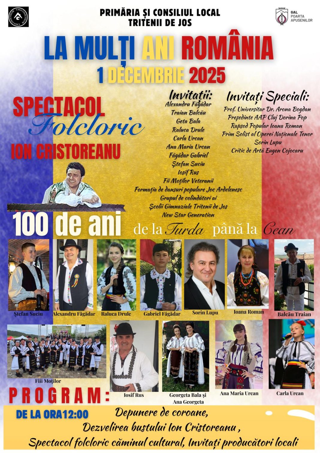 Anul acesta, marcăm 1 Decembrie 2025 printr-un amplu Spectacol Folcloric Ion Cristoreanu, la care vor participa numeroși artiști consacrați, ansambluri tradiționale și personalități culturale. Evenimentul include și momentul aniversar „100 de ani – de la Turda până la Cean”, omagiu adus identității și tradiției locale.