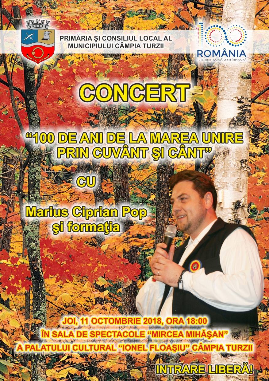 În luna dedicată vârstnicilor și în anul Centenarului Marii Uniri, administrația locală a Municipiului Câmpia Turzii a pregătit un spectacol folcloric de excepție, care-l va avea în prim-plan pe reputatul solist de muzică populară, preot, Marius Ciprian Pop.