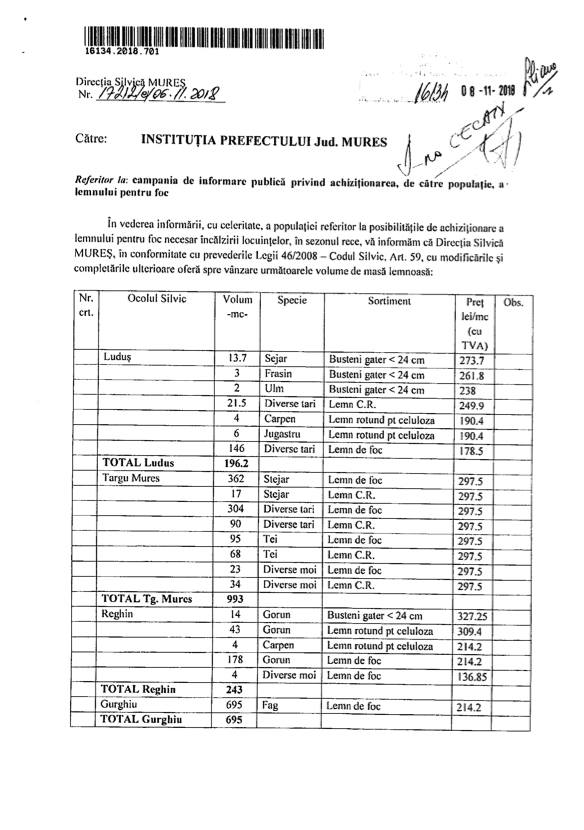 Instituția Prefectului județului Mureș a publicat în această săptămână o informare cu privire la disponibilitatea unor cantități de masă lemnoasă, care este destinată vânzării către cetățeni.