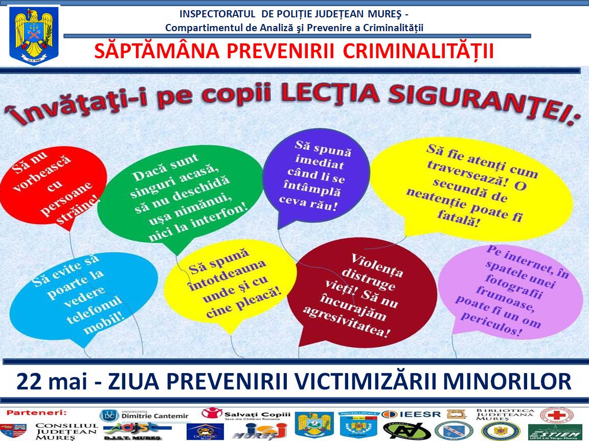 „Săptămâna Prevenirii Criminalităţii” este o acţiune al cărei scop este sublinierea importanţei activităţii preventive a Poliţiei şi totodată a parteneriatului cu alte autorităţi/instituţii/ONG-uri.