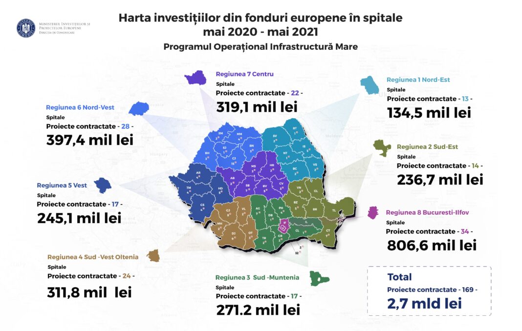 Ministerul Investițiilor și Proiectelor Europene, prin Autoritatea de Management pentru Programul Operațional Infrastructură Mare 2014 – 2020, a asigurat, în perioada 15 mai 2020 – 15 mai 2021, finanțări în valoare de 2,7 miliarde lei pentru spitale și centre sociale din România, pe fondul provocărilor apărute în urma pandemiei de COVID-19.