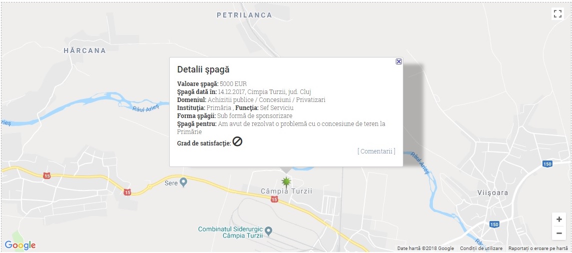 Cel care a redactat sesizarea vorbește despre faptul că, în luna decembrie a anului 2017, a dat 5000 de euro sub forma unei sponsorizări, unui șef de serviciu din Primăria Câmpia Turzii, pentru a-i intermedia o concesiune de teren.