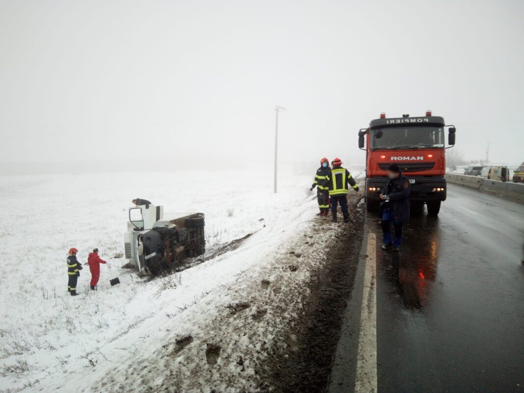 Pompierii au găsit autoutilitara răsturnată pe partea laterală, în afara părții carosabile, iar șoferul era ieșit din aceasta.