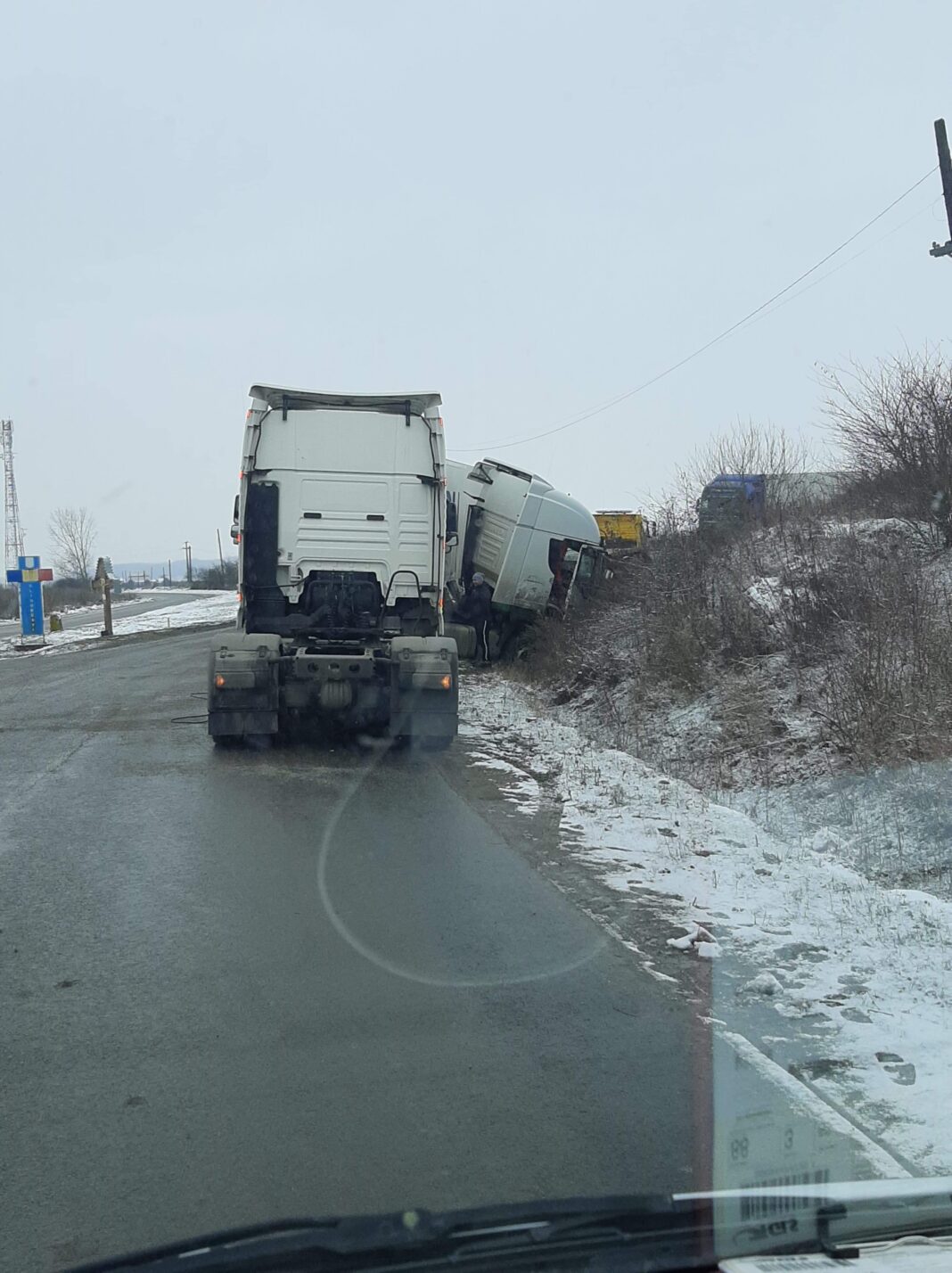 Din cate se pare, soferul unui camion ar fi pierdut controlul volanului si s-a rasturnat in sant.