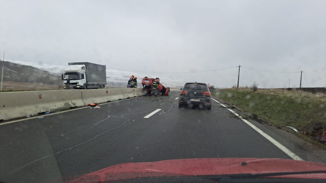 Un autoturism a sarit, efectiv, peste parapetul care separa sensurile de mers de pe DN1, la Martinesti.
