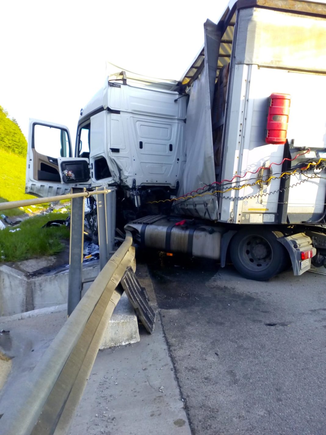 Pompierii au găsit un ansamblu de vehicule avariate (cap camion și remorcă), avariate și poziționate peste balustrada de pe partea dreaptă a carosabilului.