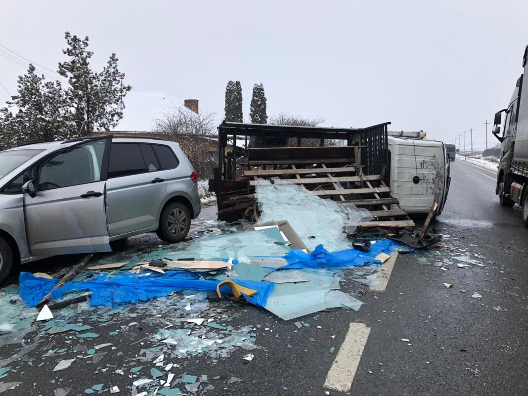 Solicitarea a fost înregistrată în jurul orei 9.20, iar la locul evenimentului, pompierii au găsit două autoturisme avariate și o autoutilitară răsturnată.