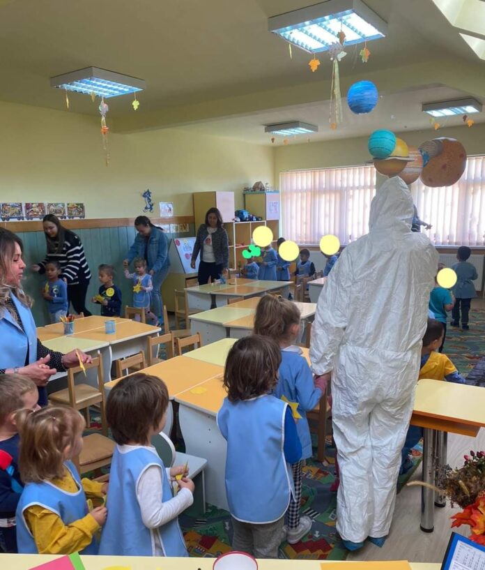 📍  Și pentru că o asemenea activitate avea nevoie și de elemente de decor, acesta a fost alcătuit din spații intergalactice și o navetă spațială care parcurge distanțe de ani-lumină printre sori și planete. Și pentru că omul este cutezător, preșcolarii au fost vizitați și de către un „astronaut” care i-a invitat în naveta spațială și, astfel, au făcut cunoștință cu... Calea Lactee. Copiii nu au ezitat să-și comercializeze acadelele. Unde? Fiecare copil și-a dezvoltat abilitățile antreprenoriale pe propria steluță care, la revenirea pe Pământ, a rămas agățată pe bolta cerească. Astfel, misiunea spațială s-a încheiat cu succes, preșcolarii aterizând voioși într-o poză de grup.