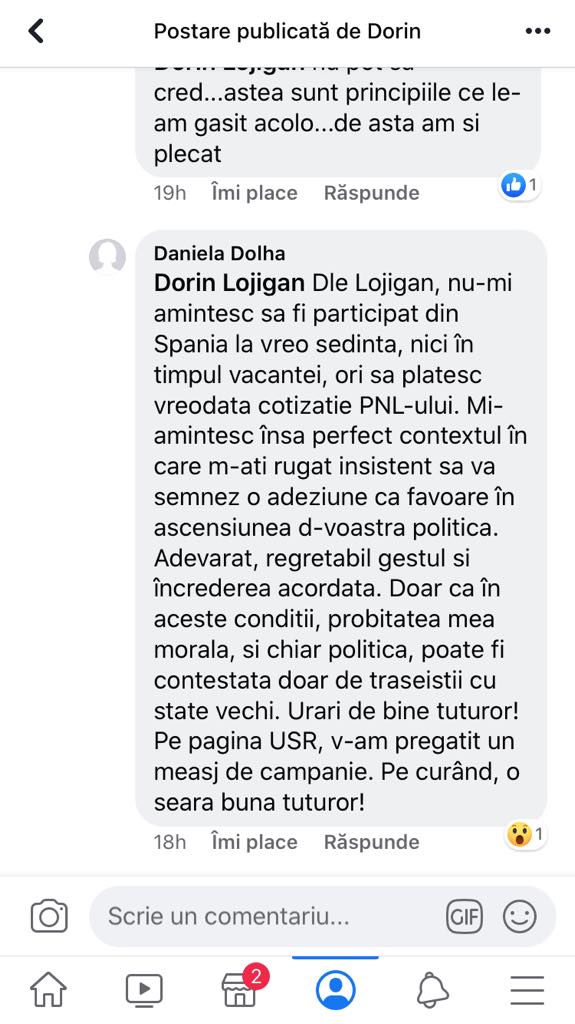 Danielei Dolha i s-a luat după ce Lojigan a zis că… „Și așa ar fi dacă v-ați respecta principiile. Eu personal as aprecia asta având in vedere viitoarea colaborare. Dar când pentru voi oameni noi in politica înseamnă vechi membrii Pnl, Psd sau Unpr (Mandrutiu, Hatos, Bradu, Daniela Dolha, Mursoi Mihai) atunci am voie sa ma abțin.”