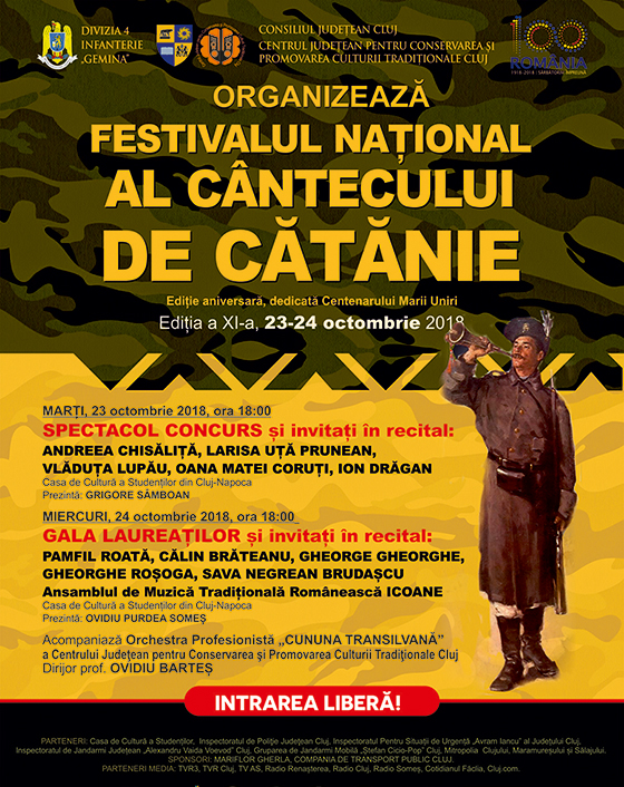 Centrul Judeţean pentru Conservarea şi Promovarea Culturii Tradiţionale Cluj, instituție de cultură aflată în subordinea Consiliului Județean, împreună cu Divizia 4 Infanterie Gemina, invită publicul interesat să participe în perioada 23-24 octombrie a.c. la cea de-a XI-a ediție a Festivalului Naţional al Cântecului de Cătănie, ce va avea loc la Cluj-Napoca, la Casa de Cultură a Studenților.