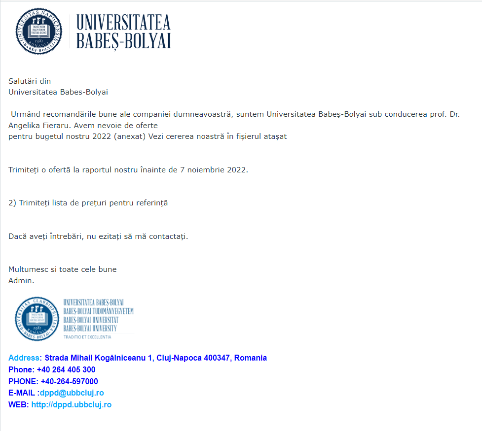 Urmând recomandările bune ale companiei dumneavoastră, suntem Universitatea Babeș-Bolyai sub conducerea prof. Dr. Angelika Fieraru. Avem nevoie de oferte