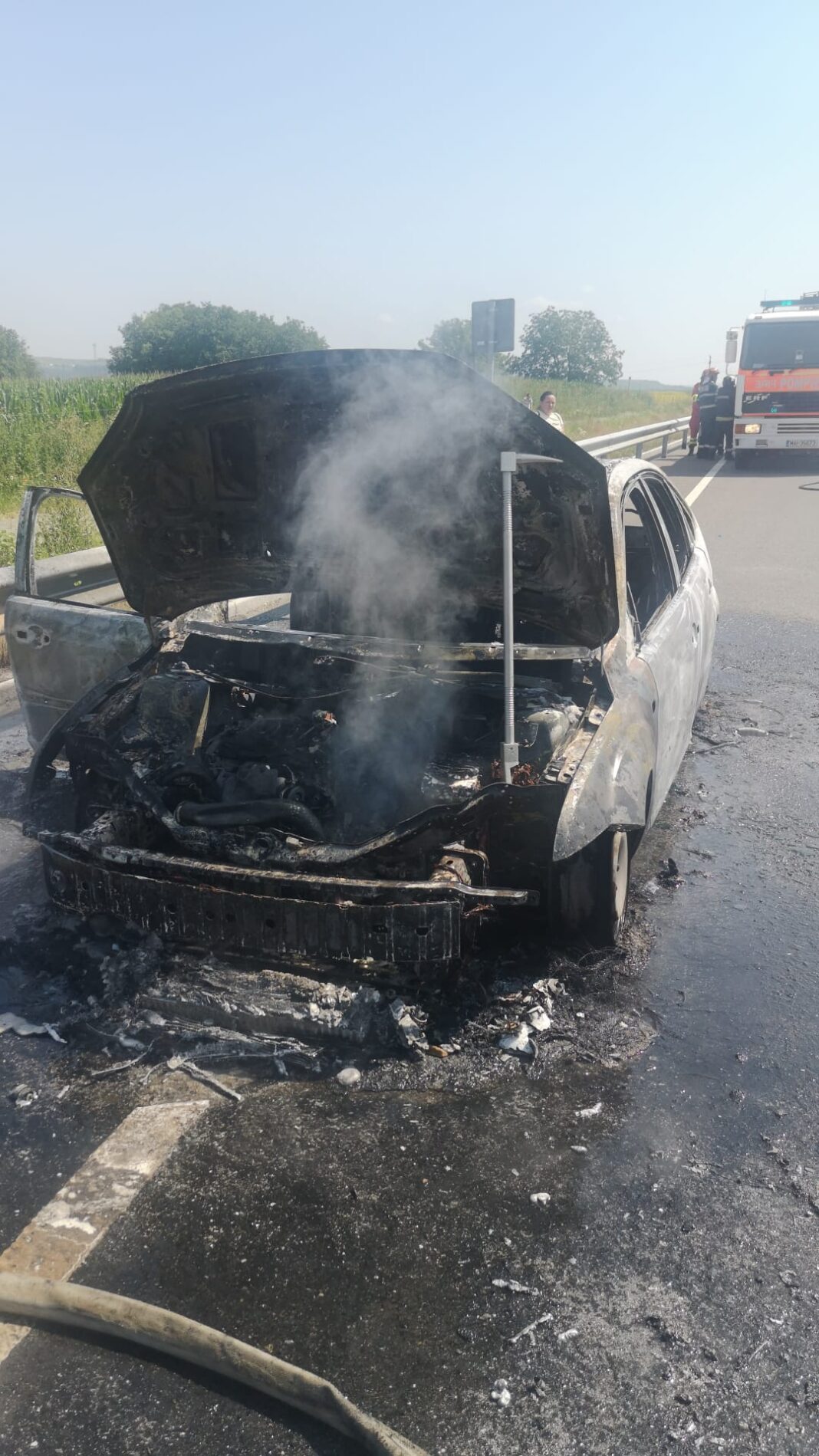 Un autoturism a ars in totalitate, la Chetani, langa intrarea pe autostrada.
