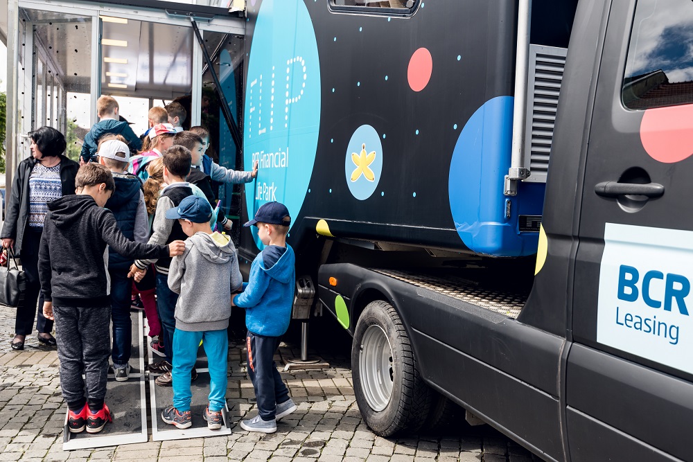 Programul Școala de bani pe Roți oferă cursuri gratuite de educație financiară și îi încurajează pe elevii între șapte și 14 ani să devină mici detectivi care descoperă, prin jocuri, cum circulă banii prin lume, cum să economisească și cum să gestioneze un buget. Atelierele au loc în camionul FLiP, special amenajat ca un loc de joacă și sală de curs. Timp de 90 de minute, grupuri de câte 15 elevi sunt ghidați de traineri specializați, într-o călătorie care are drept scop să explice pe înțelesul celor mici noțiuni financiare de bază.