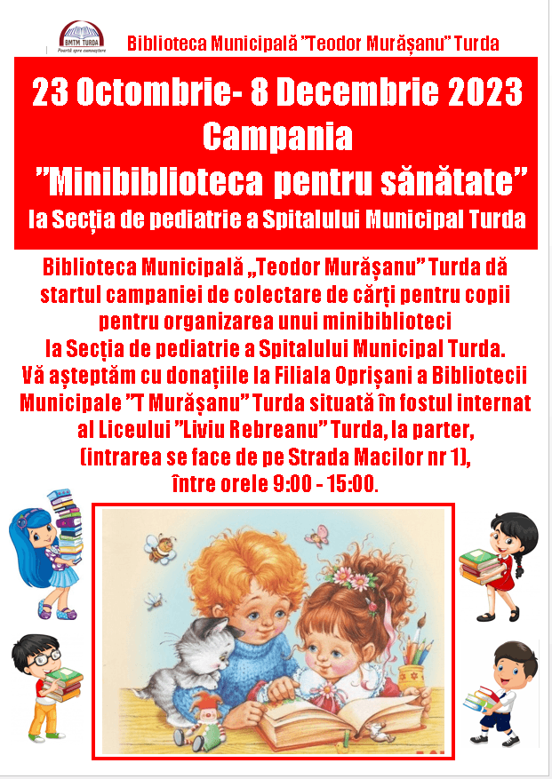 În luna septembrie a.c., când bibliotecarele de la Biblioteca Municipală ”Teodor Murășanu” Turda au pictat pro-bono pereţii Secției de pediatrie a Spitalului Municipal Turda, Dl Dr Dobre Mihăiță, Șeful Secției de pediatrie din Spitalul Municipal Turda, a apelat la noi cu rugămintea de a organiza o minibibliotecă pentru copiii internați aici. De aceea, Biblioteca Municipală ”Teodor Murășanu” Turda vă invită să ne fiți alături în perioada 23 octombrie- 8 decembrie 2023 la Campania umanitară de colectare de cărți pentru copii ”Mini-bibliotecă pentru sănătate la Secția de pediatrie a Spitalului Municipal Turda” pentru a oferi sprijin micilor pacienți în perioada internării. În medie la această secție sunt internați săptămânal între 15-20 copii, în general de vârste mici. Pentru pacienți, cărțile sunt binevenite, pentru că le oferă posibilitatea de a-și ocupa timpul cu o activitate plăcută, iar terapia prin lectură este foarte apreciată în întreaga lume. Ajutați de comunitate, dorim să ducem lumea minunată a cărților într-un spațiu în care grija pentru sănătatea corpului trebuie dublată de preocuparea pentru sănătatea minții pentru a le oferi pacienților și aparținătorilor o activitate în perioada internării. Cartea este un pansament pentru suflet, iar în lungile ore și zile petrecute în spital, timpul poate fi un aliat și nu un dușman. Haideți alături de noi ca să facem viața mai ușoară pe parcursul spitalizării, copiilor internați! Alături de comunitate am făcut lucruri frumoase și cu alte campanii. Reconstruim biblioteci împreună! În 11 august 2021 am ajutat la refacerea fondului de carte a Bibliotecii Ocoliș care a trecut prin inundații catastrofale, în ianuarie 2022, împreună cu voi am adunat cărți pentru Biblioteca comunală Triteni, iar în 10 martie 2022 am donat cărți pentru biblioteca Liceului Teoretic ”Josika Miklos” Turda. Deci știm că se poate! De aceea vă așteptăm să vă alăturați acestui proiect menit să aducă alinare pe chipul copiilor internați în spitale. Dacă copiii sau nepoții Dv au crescut, puteți aduce zâmbetul pe buzele copiilor spitalizați cu cărțile acestora pe care nu le mai folosesc și le puteți dona. Demersului nostru s-a alăturat deja și Dl avocat Tudor Tomșa-Stoian, prieten vechi al instituției noastre, care a demarat campania de colectare de cărți pe grupul de Facebook ”Read for Free”. Cei care vor să doneze cărți pentru micii pacienți au timp să o facă până în 8 decembrie a.c. Pentru că majoritatea copiilor internați au vârste mici, cărțile donate vă rugăm să fie adecvate copiilor de grădiniță și celor din ciclul primar și să fie noi sau într-o stare cât se poate de bună. Vă așteptăm cu donațiile la Filiala Oprișani a Bibliotecii Municipale ”T Murășanu” Turda situată în fostul internat al Liceului ”Liviu Rebreanu” Turda, la parter, (intrarea se face de pe Strada Macilor nr 1), între orele 9:00 – 15:00. Daniela Deac Tel: 0745.64.66.64 E-mail: bmtmturda@yahoo.com Biblioteca Municipală “T Murăşanu” Turda