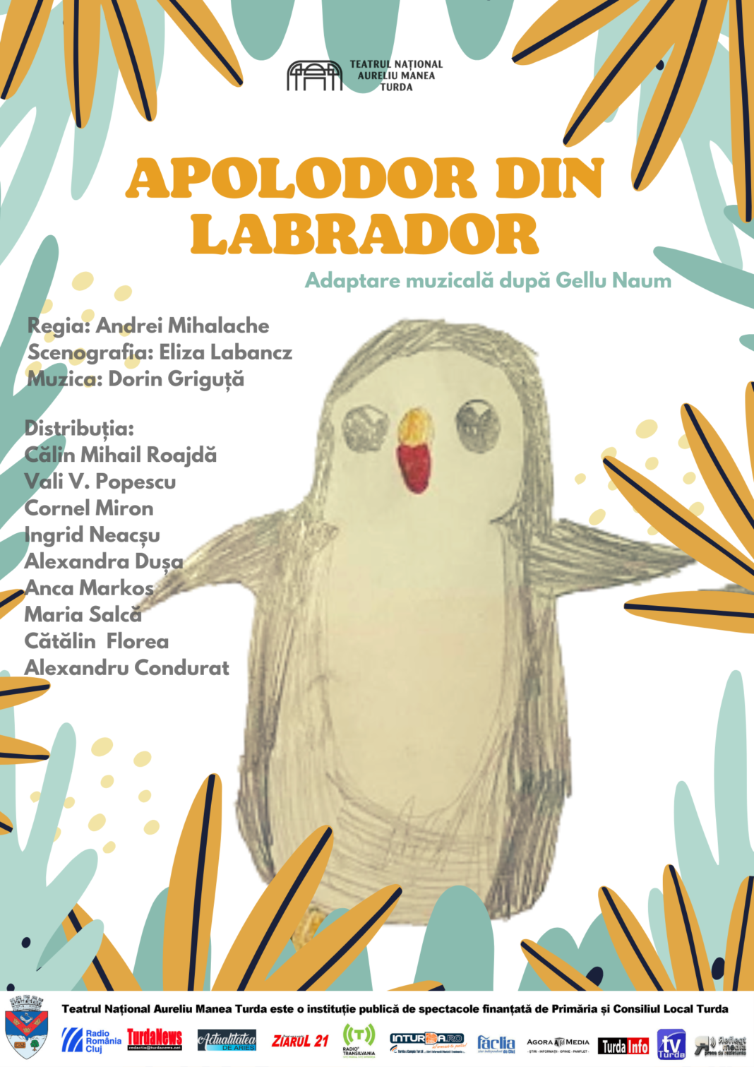 Începutul lunii aprilie aduce o zi de sărbătoare pentru micii spectatori care sunt invitați la premiera spectacolului Apolodor din Labrador. Adaptarea muzicală după textele lui Gellu Naum îl are ca regizor pe Andrei Mihalache, iar premiera va avea loc duminică, 3 aprilie, de la ora 11:00, în Sala Mare a Teatrului Național Aureliu Manea Turda.
