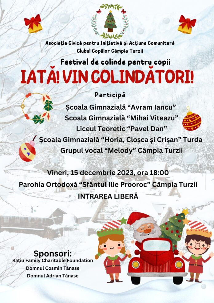 Asociația Civică pentru Inițiativă și Acțiune Comunitară, în parteneriat cu Clubul Copiilor Câmpia Turzii organizează vineri, 15 decembrie 2023, de la ora 18:00, Festivalul de Colinde „Iată, vin colindători!”.
