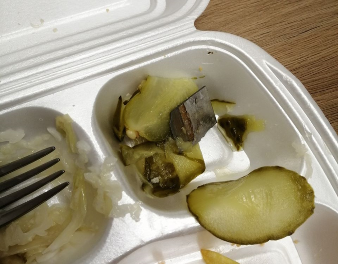 După cum se vede în fotografie, în caserolă era o lamă de cuțit ruginită care poate fi o sursă de îmbolnăvire cu tetanus.