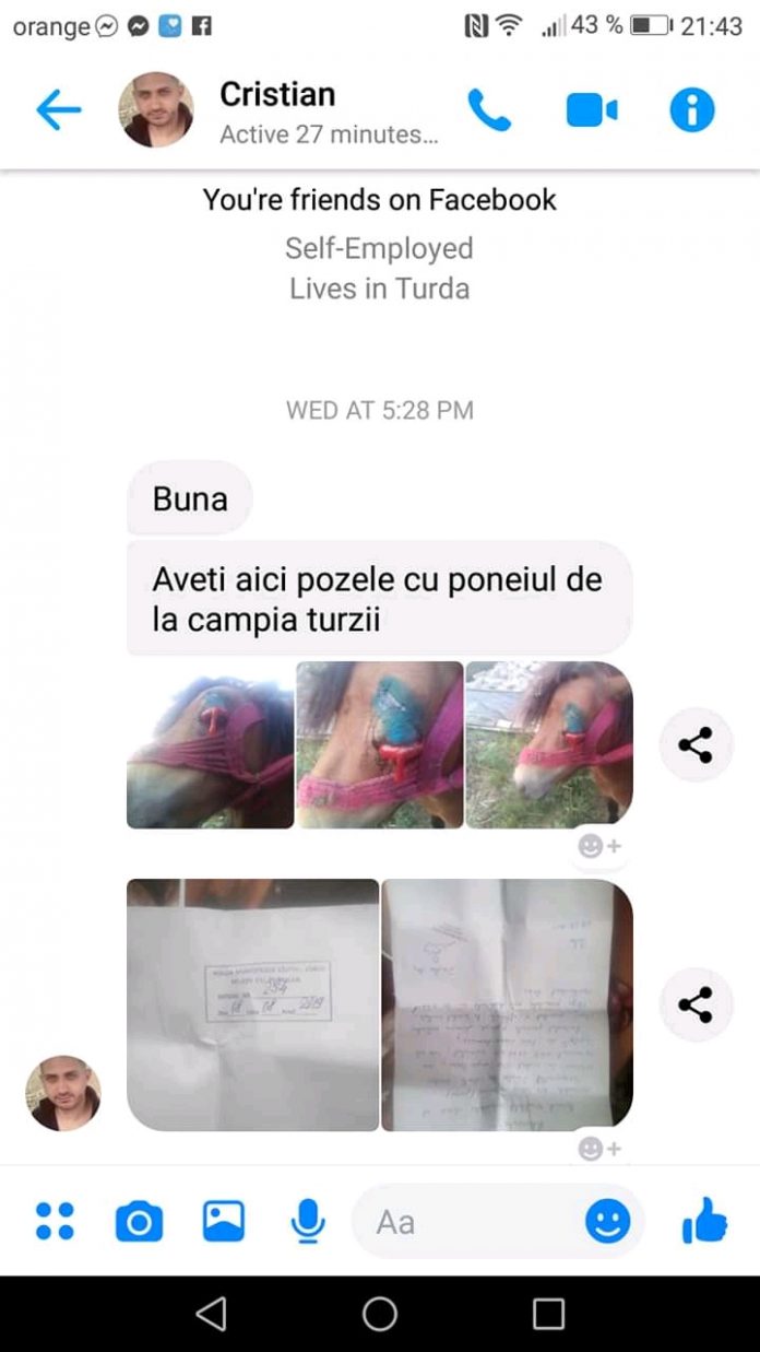 “Bună prieteni !Din păcate vin doar cu vești rele .Mi-a fost semnalat un nou caz de maltratare ,de data aceasta asupra unui ponei . Căluțul a făcut greșeala să intre în ograda vecinului ,probabil i-a făcut mici pagube dar asta nu e un motiv să-l omori .Cazul a fost trimis la Poliția Câmpia Turzii pentru rezolvare.Sper că băieții vor rezolva cazul cu obiectivitate .Suntem cu ochii pe ei …”, a spus femeia.