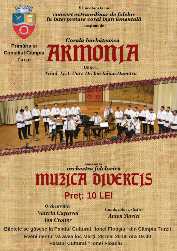 Astfel, iubitorii de muzică bună, pur românească, vor avea ocazia să asculte reprezentațiile pline de har, talent și dragoste de țară, în cadrul unui concert pe care Corala „Armonia” îl va susține în parteneriat cu Orchestra Folclorică „Muzica Divertis”.