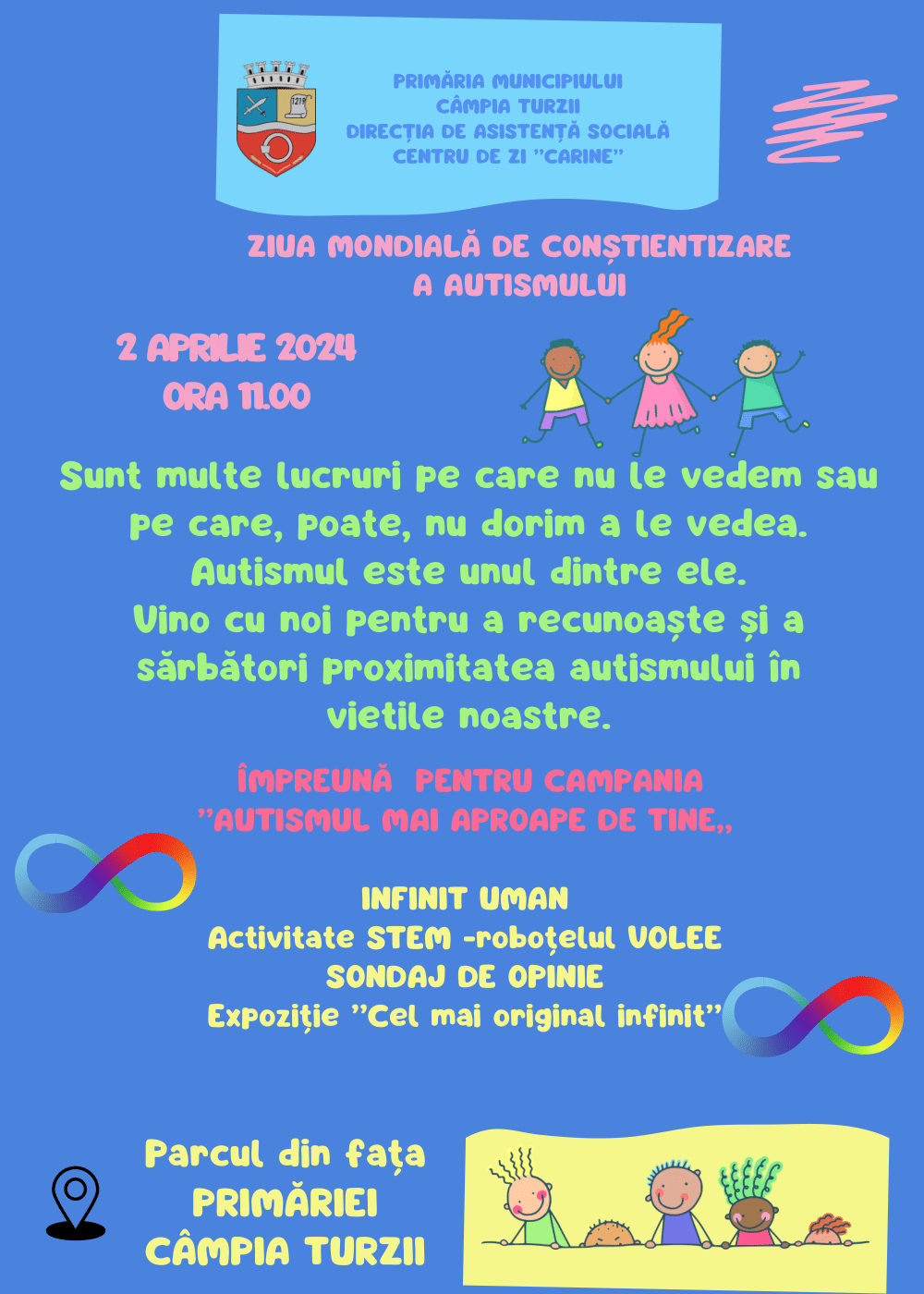 Evenimentul va avea loc în fața Primăriei Municipiului Câmpia Turzii, unde cei prezenți vor alcătui un „infinit uman”. Simbolul infinitului este adesea folosit în contextul tulburării de spectru autist (TSA) pentru a reprezenta diversitatea și complexitatea acestei tulburări.