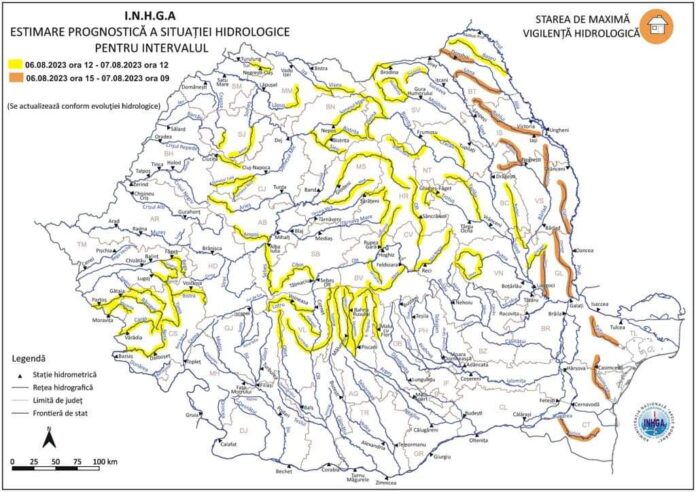 🟨COD GALBEN pentru intervalul 06.08.2023 ora 12:00 – 07.08.2023 ora 12:00 pe râurile din bazinele hidrografice: Vişeu, Iza, Lăpuş, Tur, Someşul Mare, Someşul Mic, Someş, Crasna, Crişul Repede, Mureş, Niraj, Arieş, Târnava Mică, Târnava Mare, Mureş, Bega, Timiş, Bârzava, Moraviţa, Caraş, Nera, Olt, Olteţ, Argeş, Dâmboviţa, Suceava, Moldova, Bistriţa, Trotuş, Putna, Bârlad, Siret, Jijia, Prut și râurile din Dobrogea.