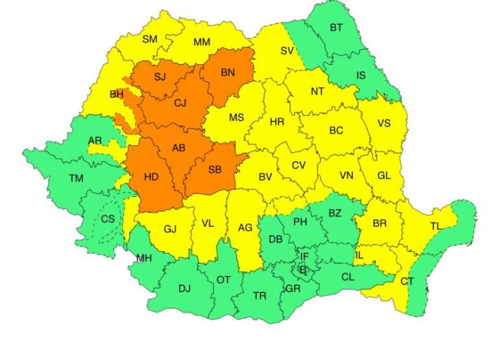 În județele Hunedoara, Alba, Sibiu, Cluj, Sălaj, Bistrița-Năsăud și zona de munte a județului Bihor, vor fi perioade cu instabilitate atmosferică accentuată. Sunt prognozate: