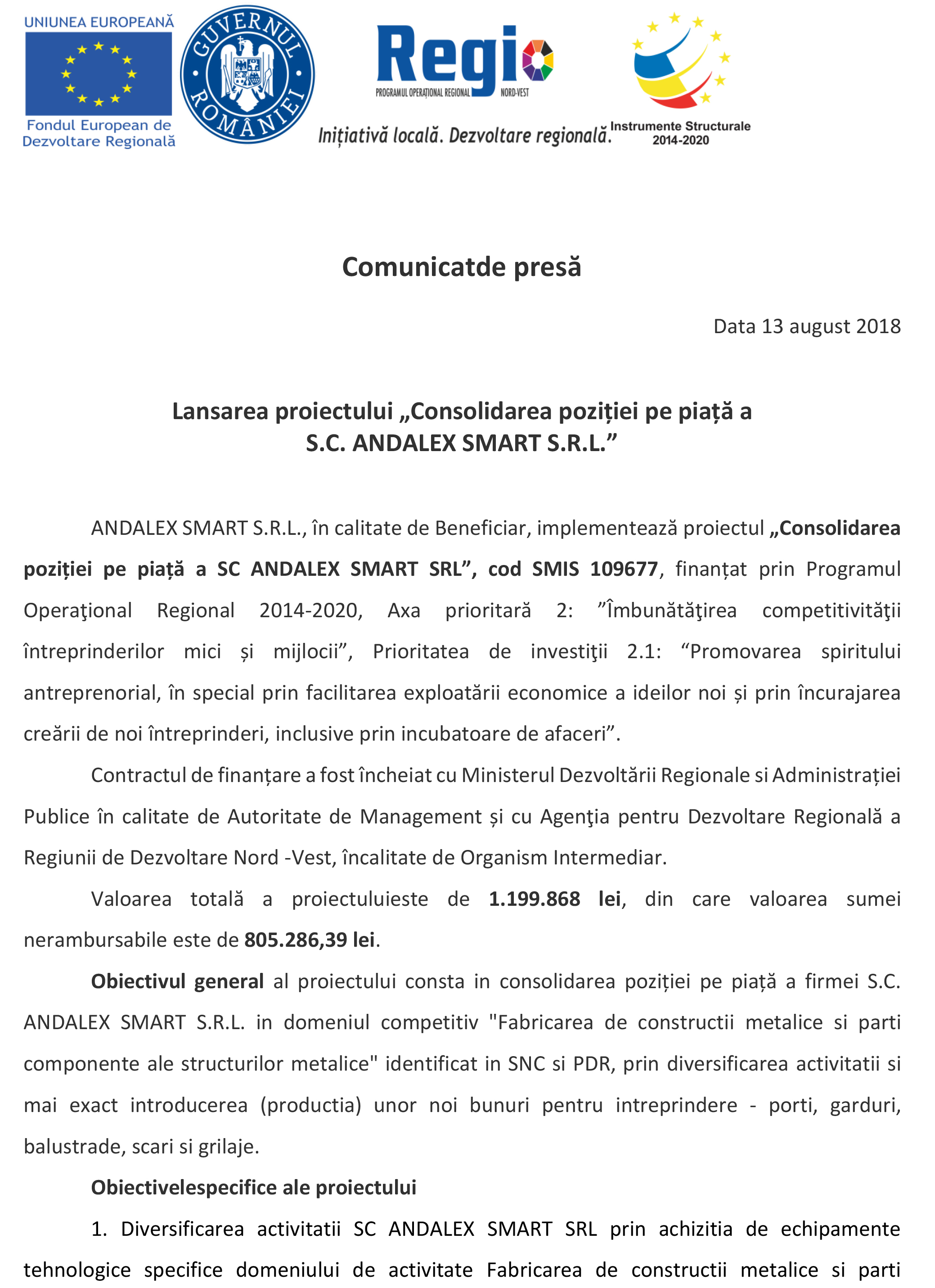 Comunicat de presă Data 13 august 2018 Lansarea proiectului „Consolidarea poziției pe piață a S.C. ANDALEX SMART S.R.L.”