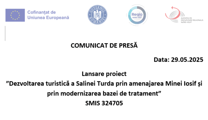 COMUNICAT DE PRESĂ Data: 29.05.2025 Lansare proiect ”Dezvoltarea turistică a Salinei Turda prin amenajarea Minei Iosif și prin modernizarea bazei de tratament”  SMIS 324705