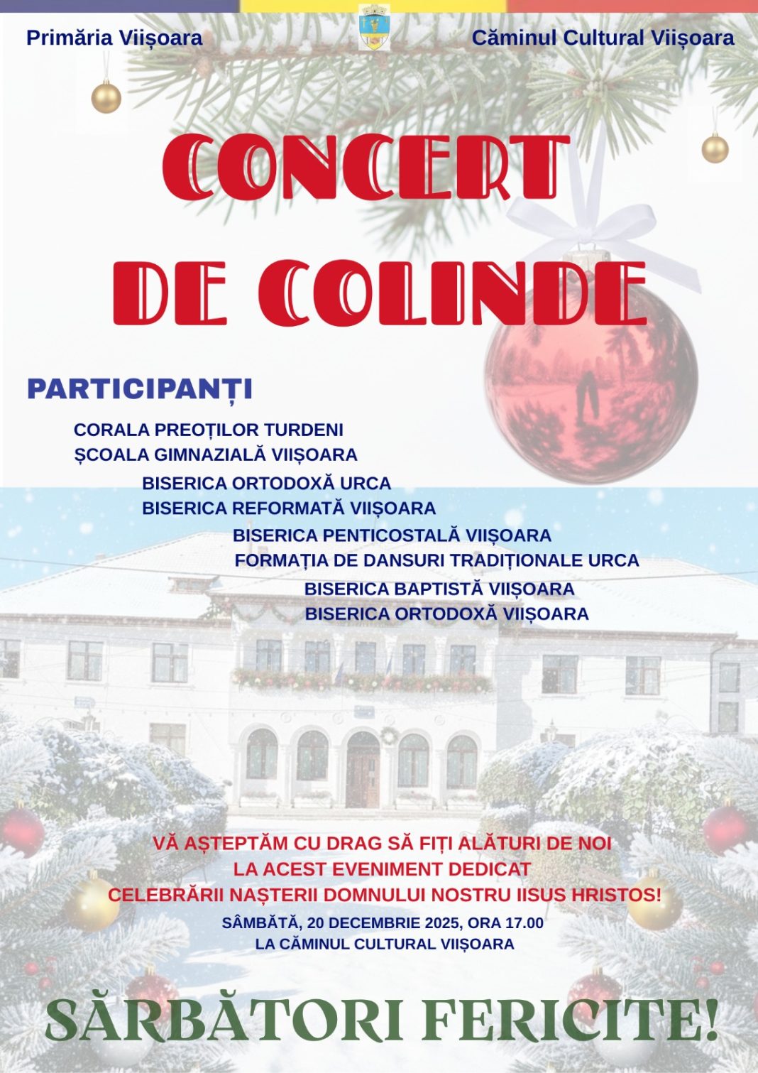 Primăria Comunei Viișoara și Căminul Cultural Viișoara invită întreaga comunitate să participe la Concertul de Colinde organizat în preajma sărbătorilor de iarnă, un eveniment dedicat celebrării Nașterii Domnului nostru Iisus Hristos și reunirii oamenilor în spiritul bucuriei și al tradițiilor românești.