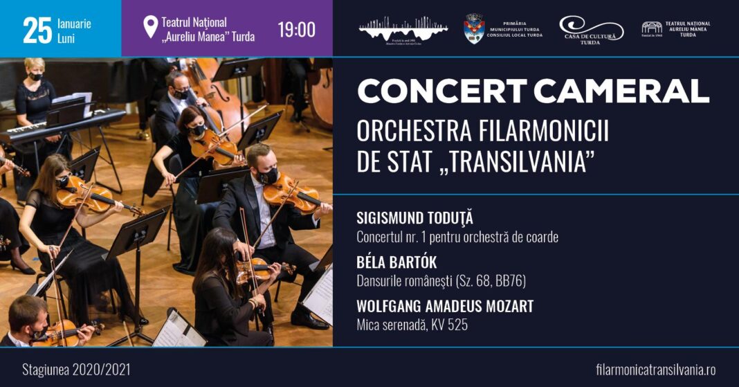 Primăria Turda și Casa de Cultură Turda vă invită la CONCERTUL CAMERAL care va fi susținut de orchestra Filarmonicii de Stat „Transilvania” din Cluj Napoca în data de 25 ianuarie 2021 de la ora 19.00 la Teatrul Național “Aureliu Manea”.