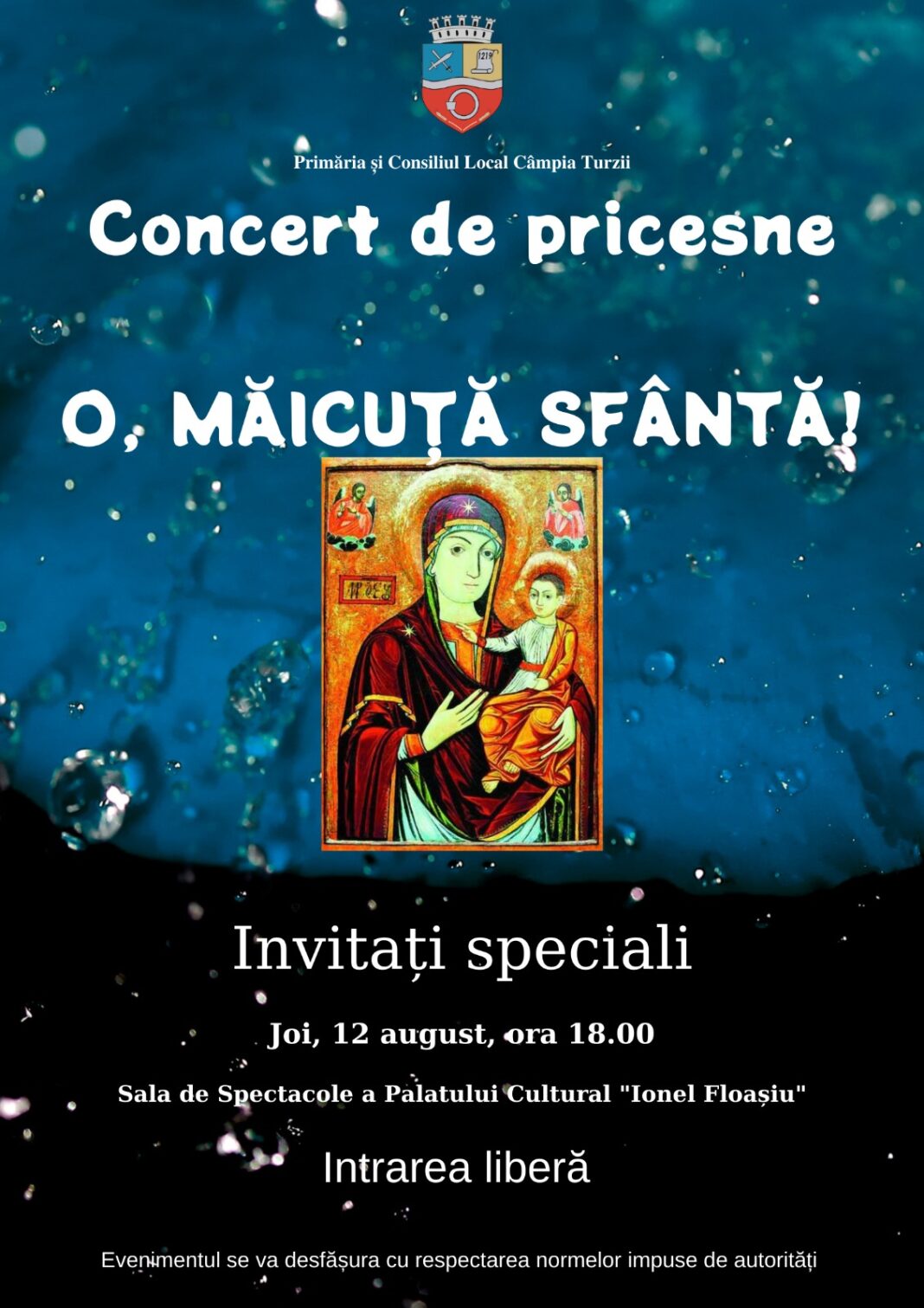 În săptămâna Adormirii Maicii Domnului – sărbătoare de mare însemnătate pentru creștinii-ortodocși și greco-catolici, Primăria Câmpia Turzii organizează un concert de pricesne, intitulat „O, măicuță sfântă!”.