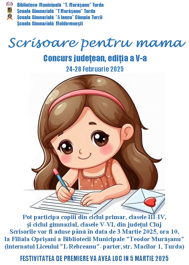 Biblioteca Municipală ”Teodor Murășanu” Turda în parteneriat cu Școala Gimnazială ”Teodor Murășanu” Turda, Școala Gimnazială ”Avram Iancu” Câmpia Turzii şi Școala Gimnazială Moldovenești organizează în perioada 24-28 Februarie 2025 a cincia ediție a concursului județean SCRISORI PENTRU MAMA.
