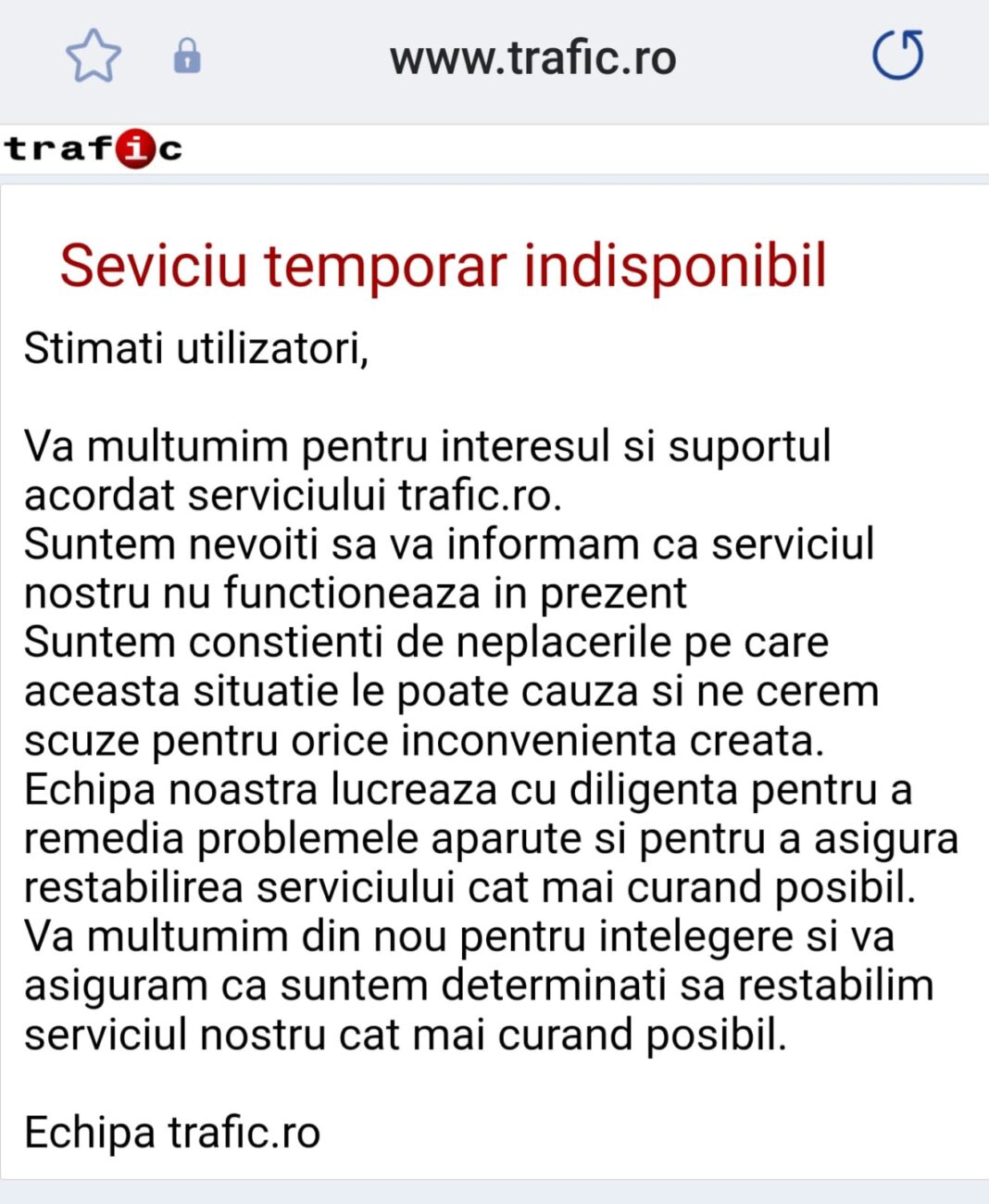 Echipa trafic.ro”, este mesajul postat pe site-ul cu pricina.