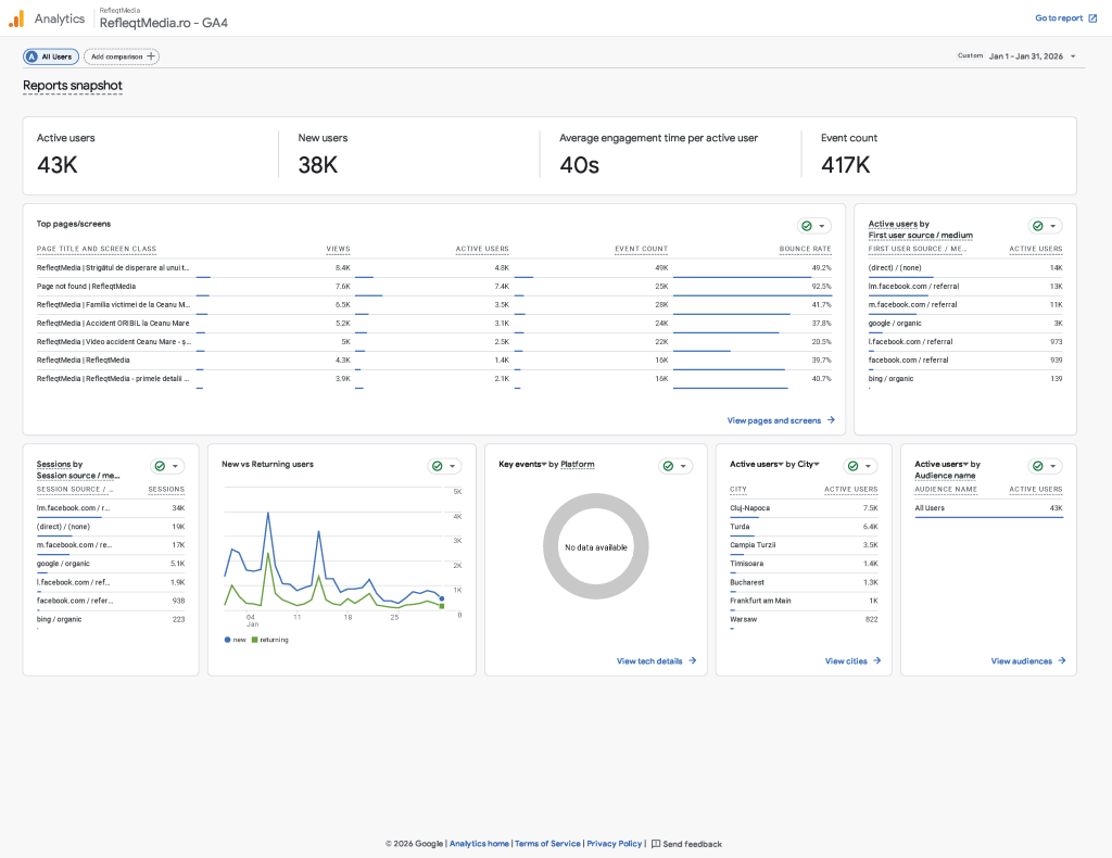 În ianuarie 2026, RefleqtMedia.ro nu a avut 11.000 de unici, așa cum se transmite pe ici pe colo, nu … a avut 43.000 dintre care 10.000 sunt din Turda și Câmpia Turzii. Poate ei au 400.000 de unici și-i felicit din suflet, dar dacă vrei să te lauzi, laudă-te cu adevărul, nu cu fabulații scoase de pe site-uri de rahat!