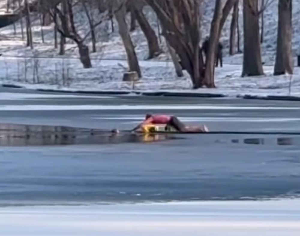 În doar câteva secunde, gheața s-a spart sub greutatea copilului, iar fetița a căzut în apă, la aproximativ 10 metri de mal. Tatăl a sărit imediat după ea, însă a rămas blocat în gheață.