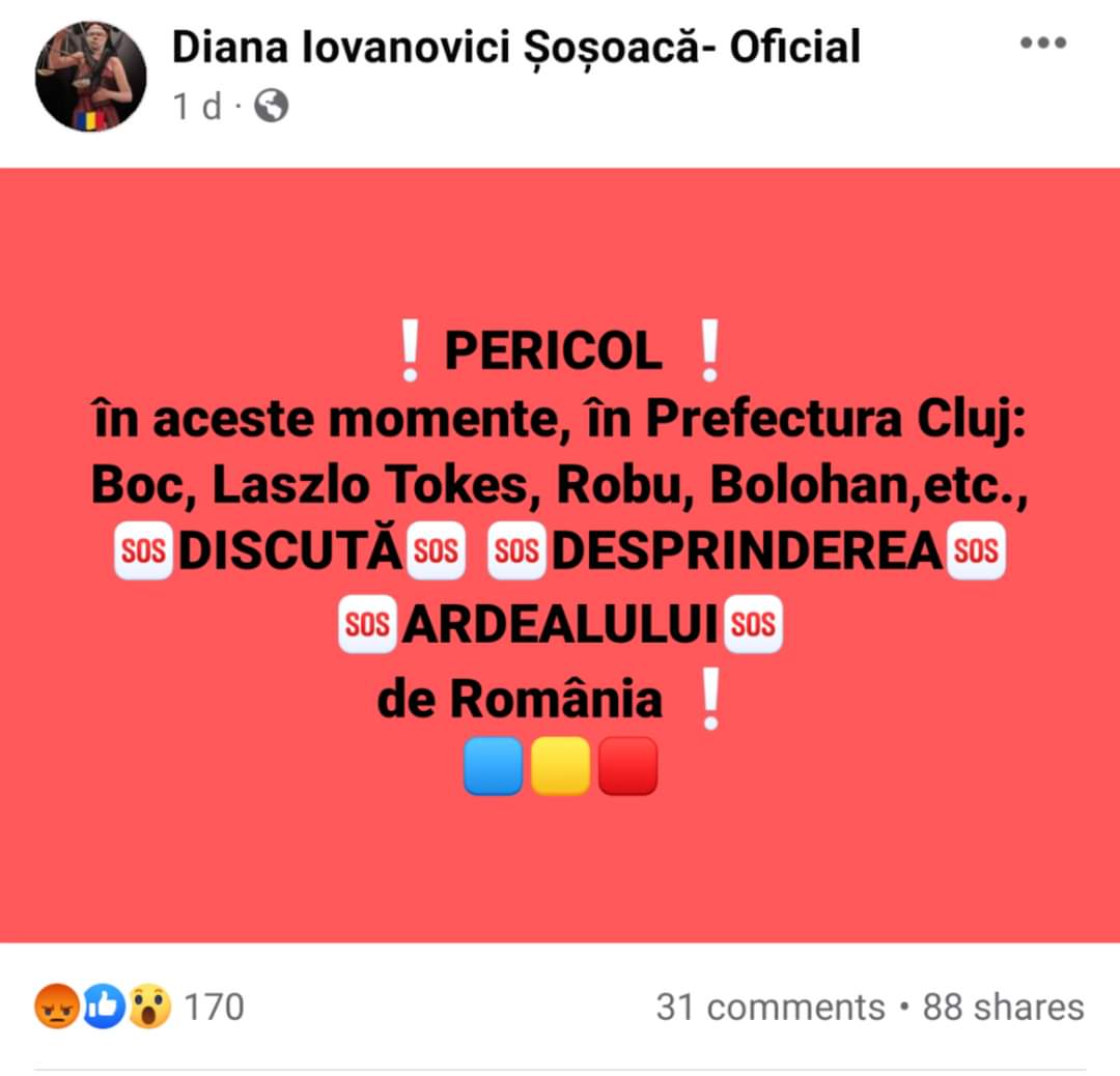 Senatoarea independenta, Diana Sosoaca, a facut o serie de afirmatii extrem de grave, pe retelele de socializare. Prin intermediul unei postari, aceasta ar fi spus ca, in aceasta saptamana, la Prefectura Cluj s-at fi discutat “desprinderea Ardealului de Romania” .