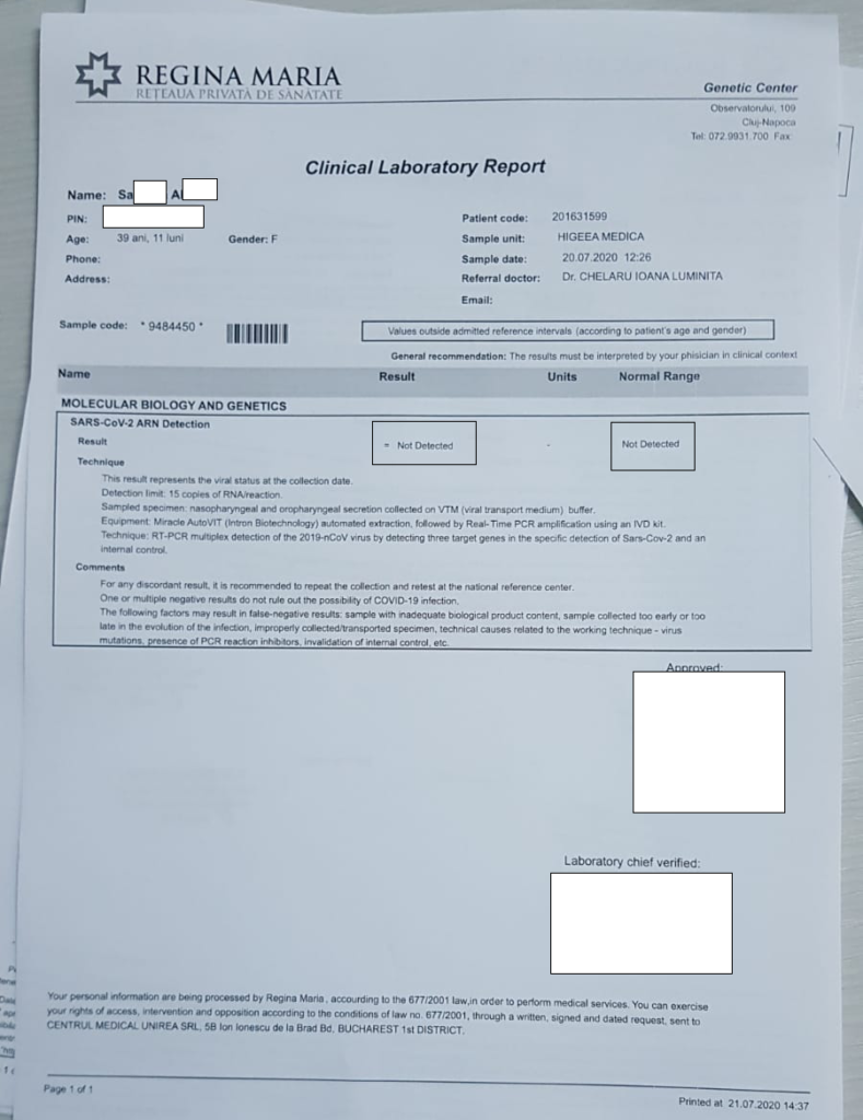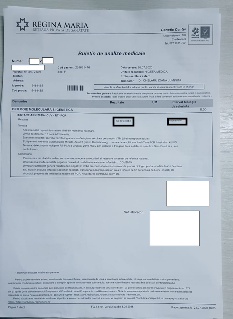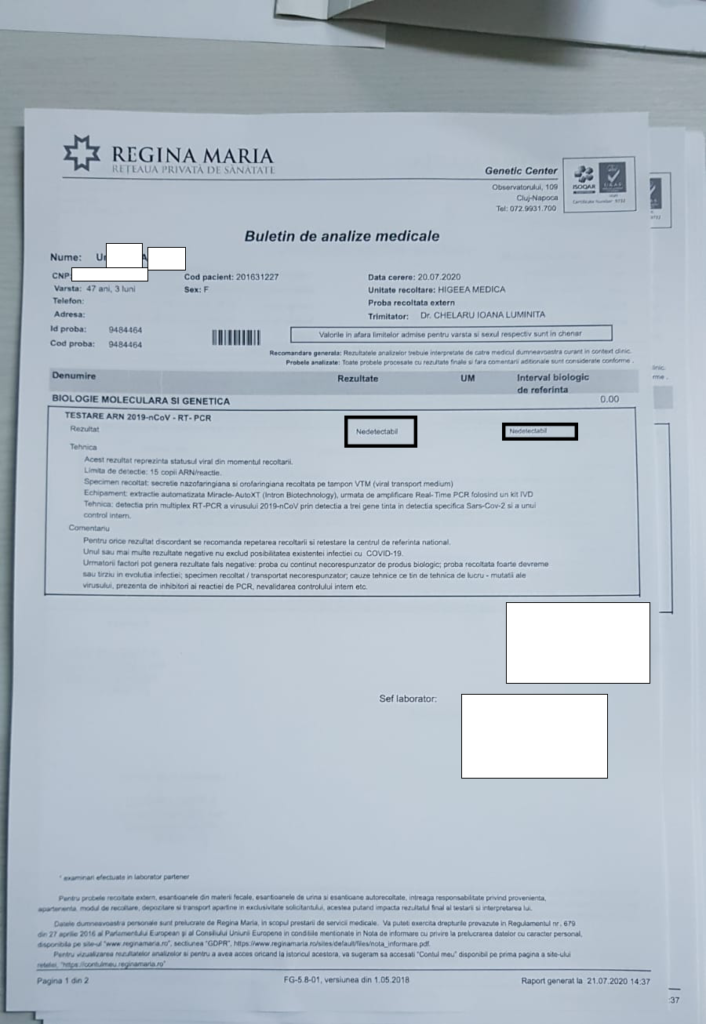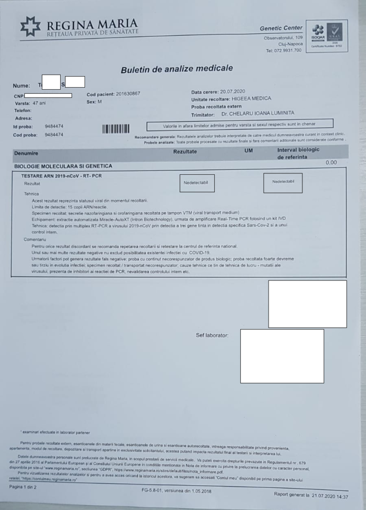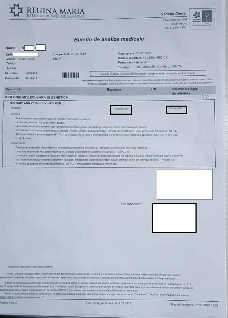 60 de teste efectuate la „Regina Maria”, la prețul de 340 de lei fiecare, TOATE FIIND NEGATIVE!