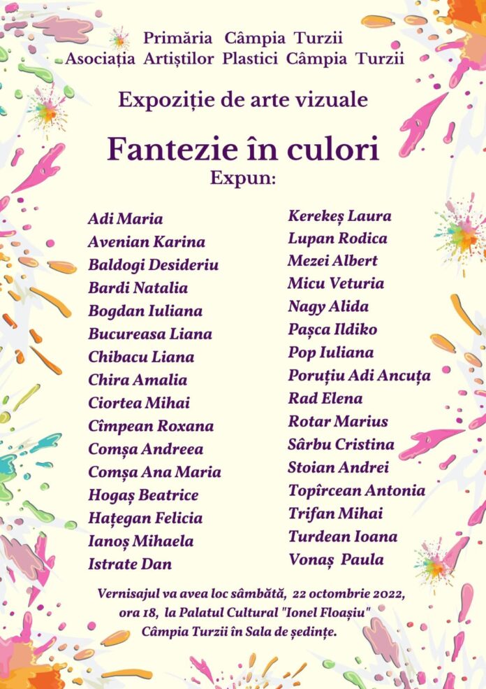 Primăria și Consiliului Local al Municipiului Câmpia Turzii, în parteneriat cu Asociația Artiștilor Plastici Câmpia Turzii organizează vernisajul „Fantezie în culori”.