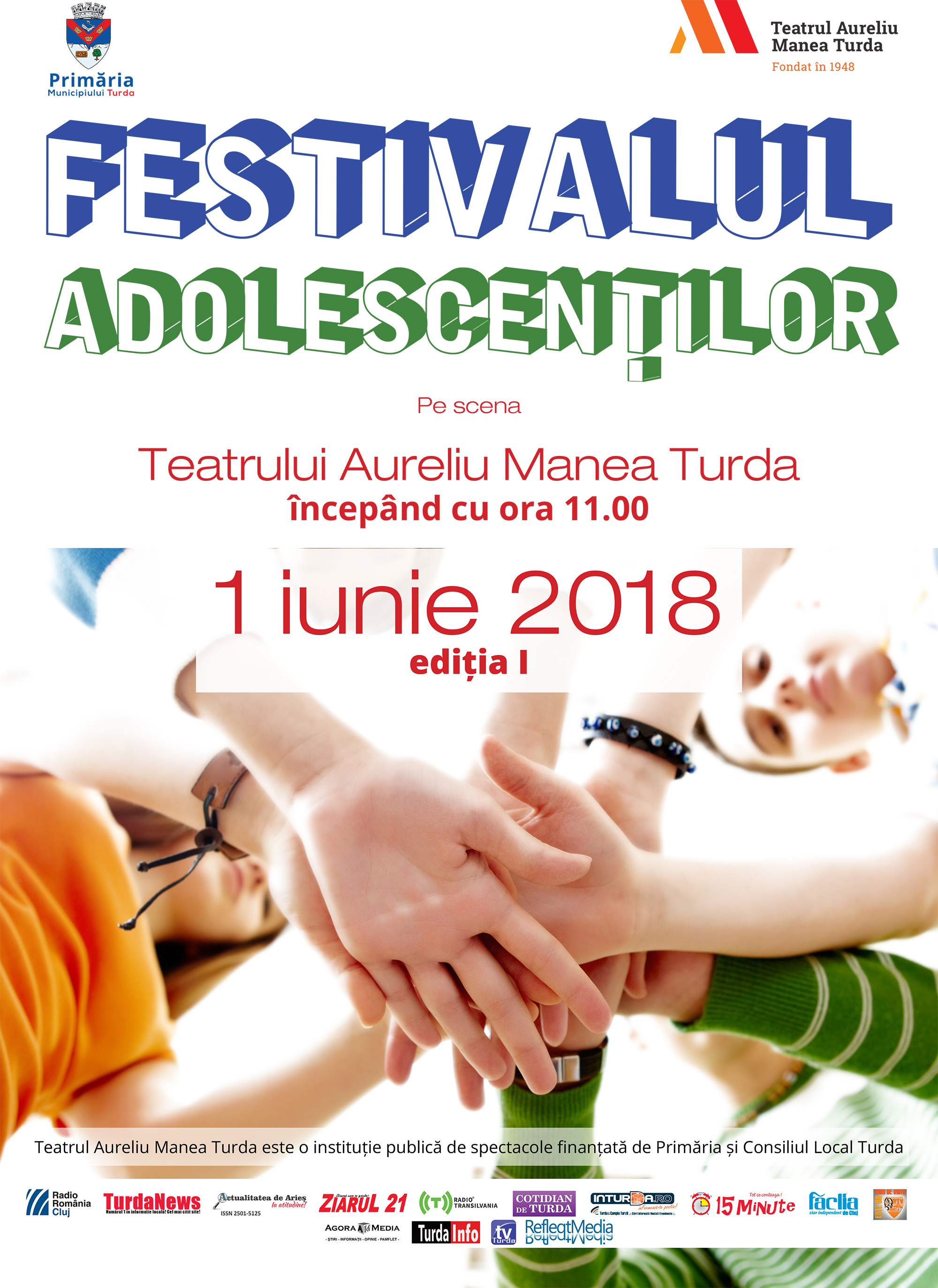 Teatrul Aureliu Manea Turda în parteneriat cu liceele din oraș, organizează în data de 01 iunie 2018 Festivalul Adolescenților și vă invită să vă susțineți favoriții. Aceasta este prima ediție și reprezintă rezultatul muncii unor actori dedicați și a copiilor talentați din oraș.