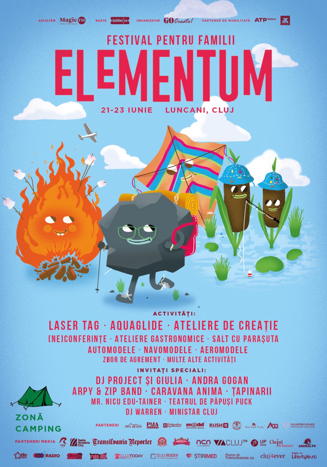 Spectacole ale Teatrului de Păpuși PUCK, Imaginarium și PICIpit sunt noutățile PĂMÂNTENE, iar parcul nautic gonflabil Aquaglide este surpriza ACVATICĂ a Festivalului Elementum– În ritmul familiei. Arpi&Zip Band, Țapinarii, Ministar Cluj, Mr. Nicu, Caravana Anima și Zănatec aduc spectacole ce vor aprinde cu siguranță FOCUL distracției, iar în AER plutește adrenalina și…Laser Tag Arena!