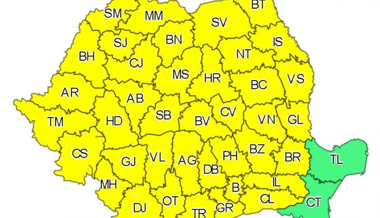Administraţia Naţională de Meteorologie (ANM) a emis luni o atenţionare Cod galben de averse torenţiale, vijelii şi grindină, valabilă până miercuri seara în 40 de judeţe.