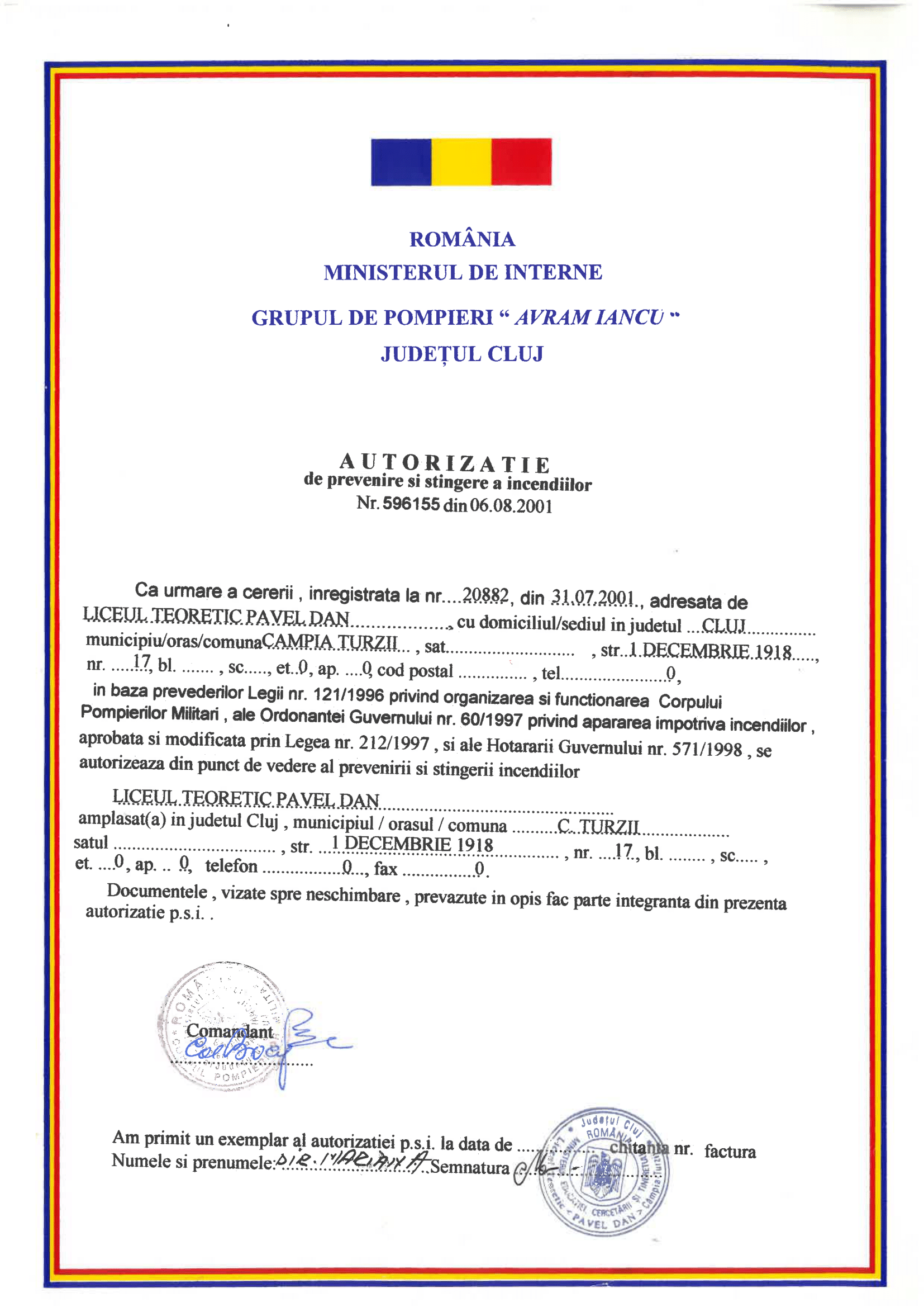 În primul rând, Liceul Teoretic Pavel Dan deține o autorizație privind securitatea la incendiu încă de dinainte ca Mihai Șandru să vizeze la politică, adică din anul 2001!!!