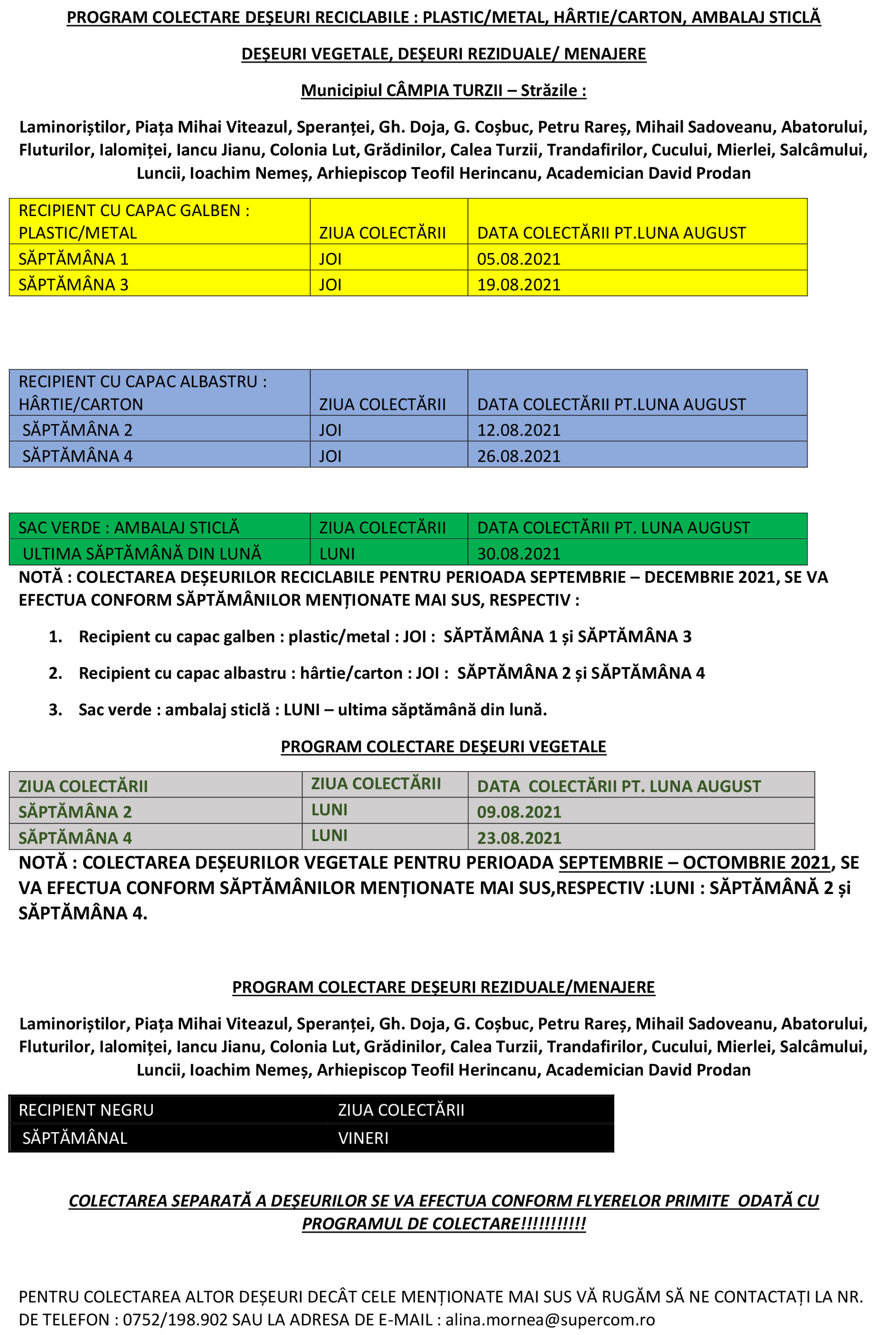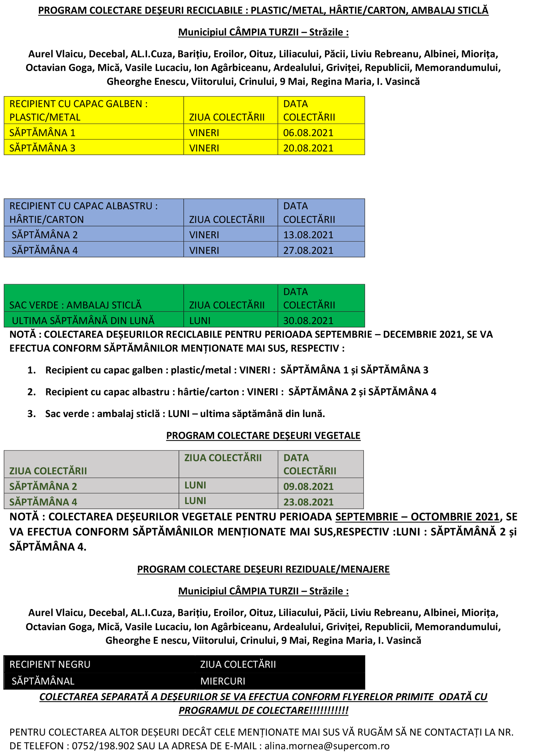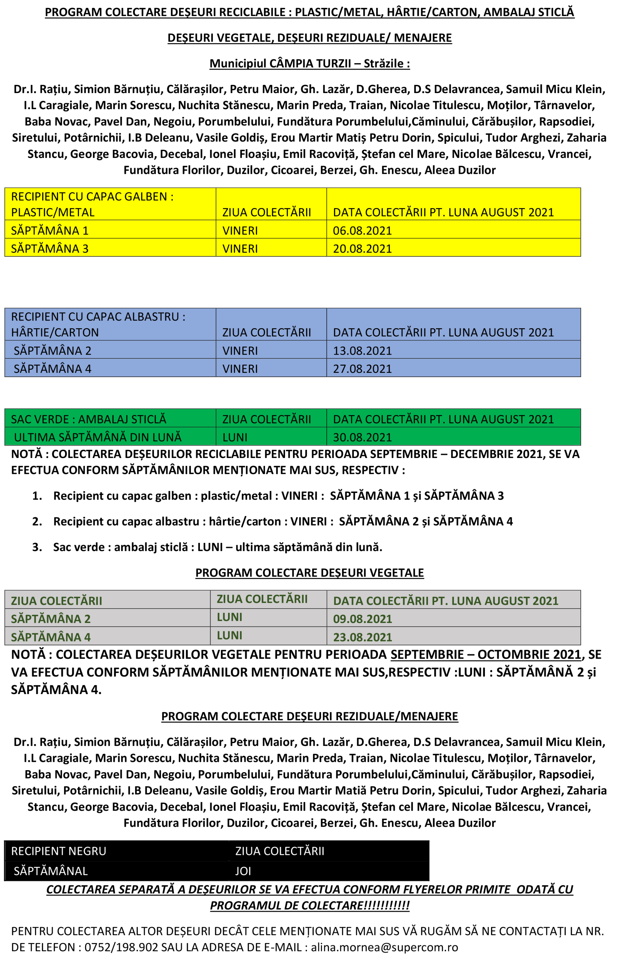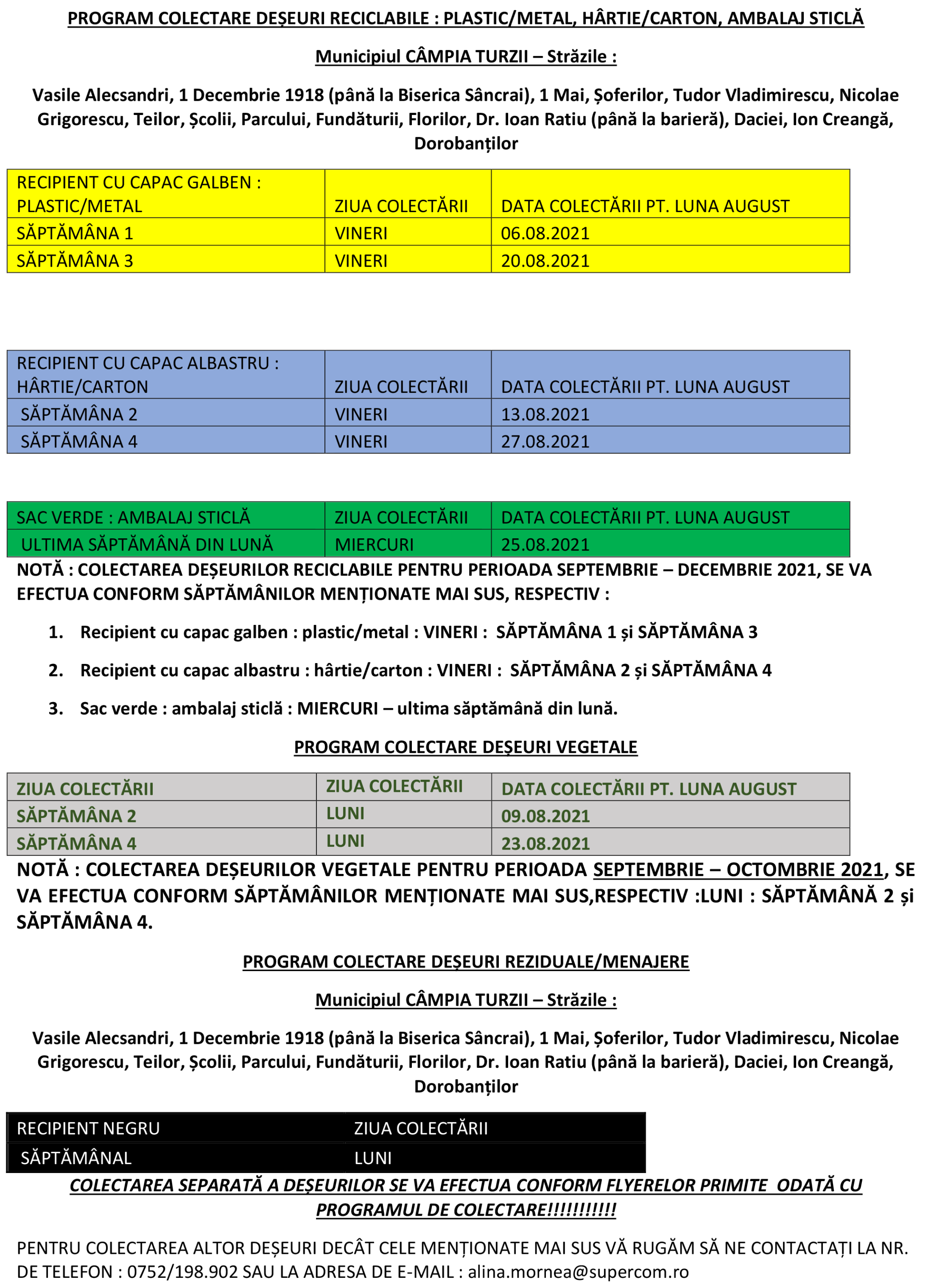 În această dimineață, Primăria Câmpia Turzii a distribuit un link către programul de colectare selectivă a deșeurilor din oraș.